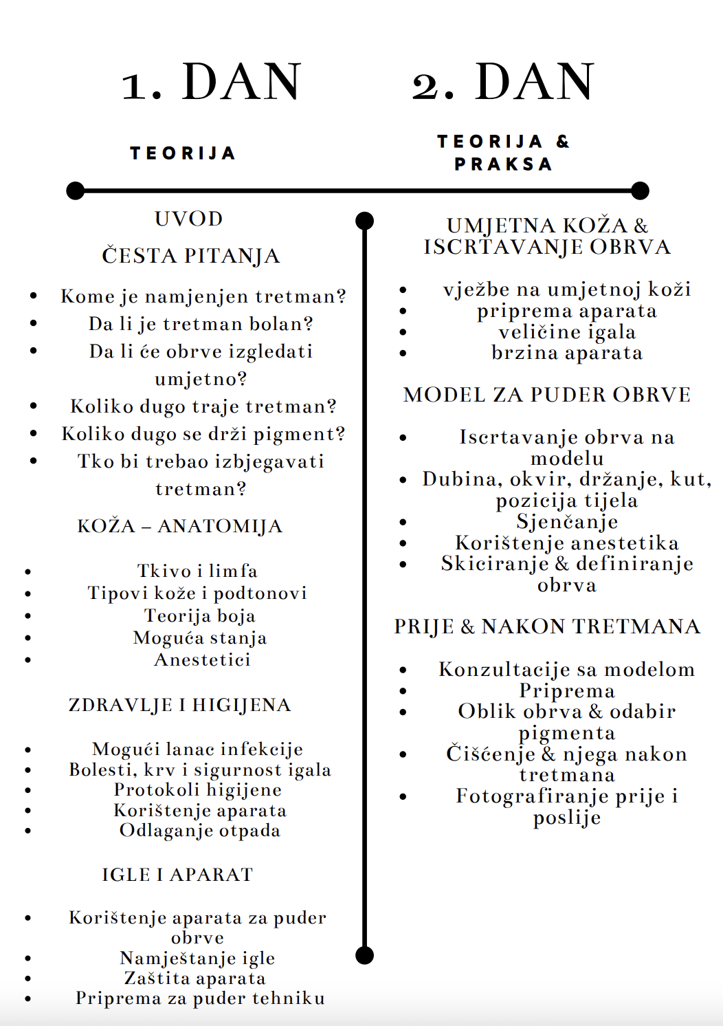 Prvi dan obuhvaća teorijski, a drugi dan praktični dio, odnosno iscrtavanje obrva na živim modelima. Modele može dovesti Vi ili ih mi organiziramo. Ukoliko edukaciju pohađate individualno, termin birate sami, u jutarnjim ili popodnevnim terminima.